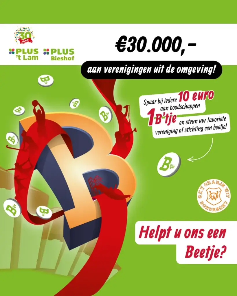 Vanaf 12 mei start bij Plus Dubbeldam & Bieshof de B’tjes actie, bij iedere 10 euro aan boodschappen verdient u dan 1 B’tje waarmee jij c.k.v. Oranje Wit kan steunen met een mooi geld bedrag. In totaal word er 30.000 euro verdeeld onder alle deelnemende verenigingen, dus hoe meer B’tjes jullie bij elkaar sparen des te groter het bedrag dat naar c.k.v. Oranje Wit gaat.
